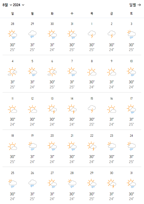 : 8월은 태풍 시즌에 해당하므로 태풍 발생 위험이 있습니다. 태풍으로 인한 비, 강풍, 홍수 등의 피해가 발생할 수 있습니다.