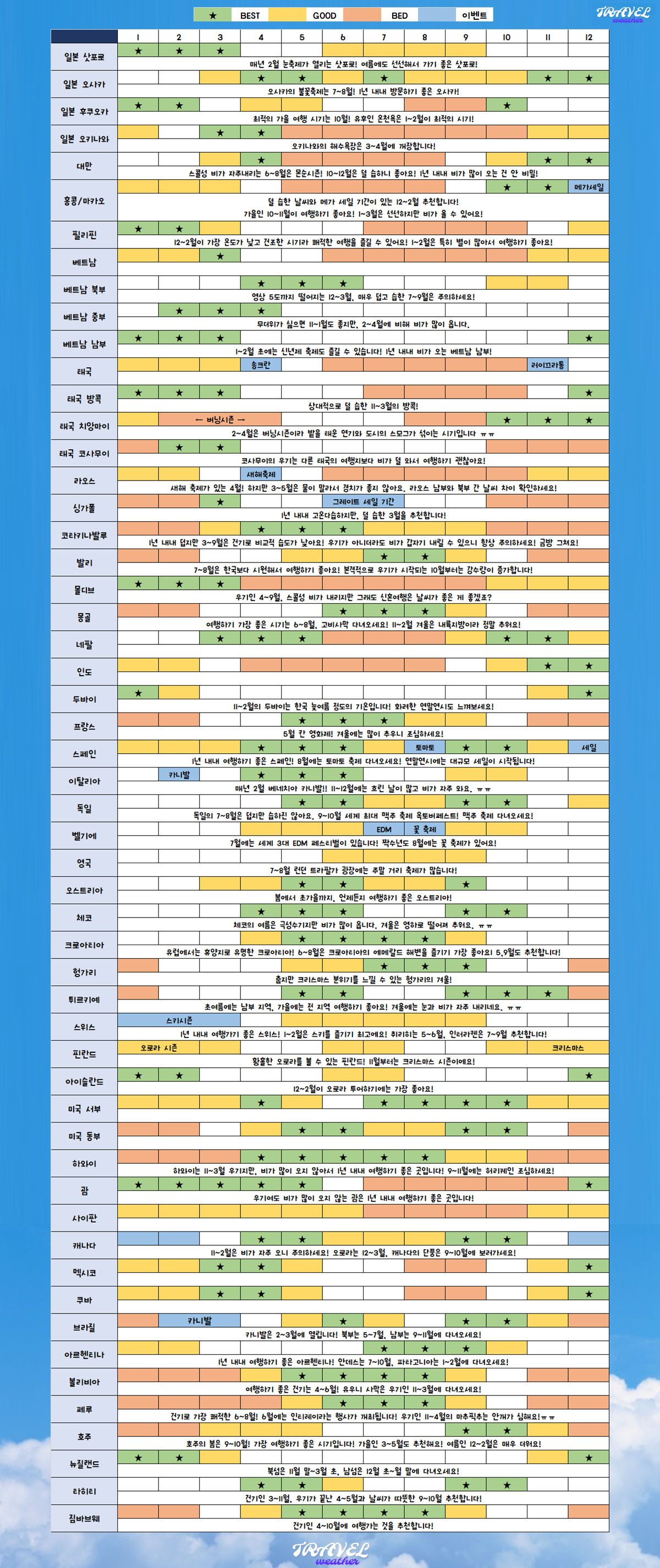 일본, 삿포로, 도쿄, 오사카, 후쿠오카, 오키나와, 대만, 홍콩, 마카오, 필리핀, 베트남, 하노이, 하롱베이, 사파, 다낭, 호이안, 후에, 호치민, 푸꾸옥, 태국, 방콕, 치앙마이, 코사무이, 라오스, 싱가폴, 코타키나발루, 말레이시아, 인도네시아, 몰디브, 몽골, 네팔, 인도, 두바이, 아랍에미레이트, 프랑스, 스페인, 이탈리아, 독일, 벨기에, 영국, 오스트리아, 체코, 크로아티아, 헝가리, 튀르키예, 스위스, 핀란드, 아이슬란드, 미국, 하와이, 괌, 사이판, 캐나다, 멕시코, 쿠바, 브라질, 아르헨티나, 볼리비아, 페루, 호주, 뉴질랜드, 타히티, 짐바브웨