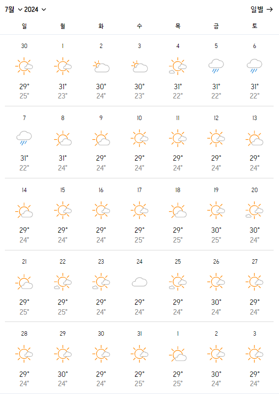 - 더운 날씨 : 평균 최고기온이 32도에 달하는 등 열대 기후로 인해 더운 날씨가 지속됩니다.